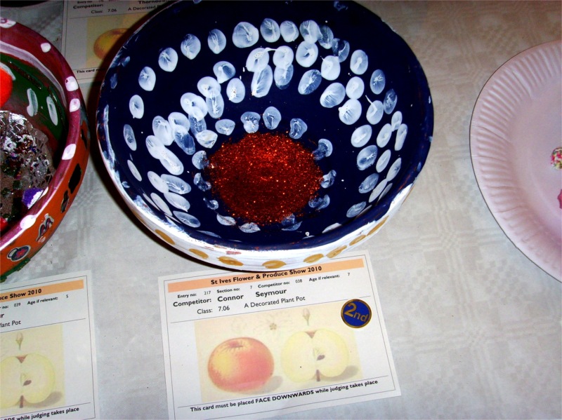Several entries from the grandchildren in the chocolate crispies and decorated plant pot classes. Connor won second place for his plant pot, Izzy third place. And Barry was second in the home brewed dry white wine class.